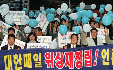 언론노조 대한매일 지부(지부장 강성남)는 노조 창립일인 13일 소유구조개편을 촉구하는 인간띠잇기 행사를 가졌다. 이날 인간띠잇기 행사에는 200여명이 참석해 대한매일 사옥을 둘러쌌다.