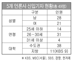 5개 언론사가 올해 채용한 신입 기자 수는 모두 49명. 먼저 연령의 경우 26세가 11명으로 가장 많았고 27세가 10명, 24세 8명, 25세 6명, 28세 4명, 29세 3명 등의 순으로 나타났다. 특히 30세 이상의 경우 30세가 3명, 31세 3명, 33세 1명 등 모두 7명이 선발됐다.