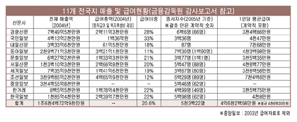 이 같은 사실은 본보가 11개 전국지의 2004년 금융감독원 감사보고서(2005년도 감사보고서는 올 3월경 제출됨)를 종합 분석한 결과 밝혀졌다. 중앙일보의 경우 인건비내역이 2003년도 자료여서 급여총액과 급여 비중을 산출하지 않았다.