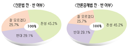 이번 조사에서는 신문법·언론중재법 인지여부, 신문법과 언론중재법에 대한 찬반, 취재과정 제약 여부, 헌법재판소 판결 전망, 가장 논란이 될 조항을 물었다.