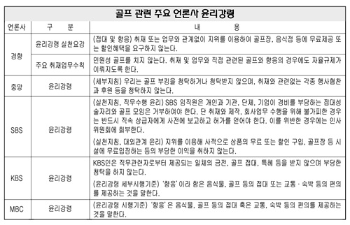 중앙의 경우 윤리강령의 세부지침을 통해 ‘우리는 골프 부킹을 청탁하거나 청탁받지 않으며, 취재와 관련없는 각종 행사 협찬과 후원 등을 청탁하지 않는다’고 명시했다.