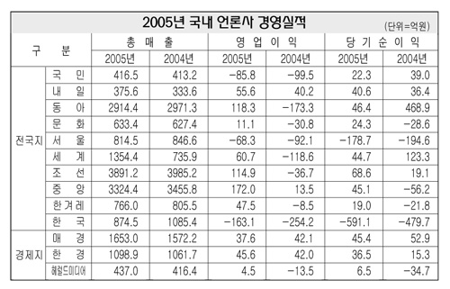 당기순이익은 국민(22억3천만원) 내일(40억6천만원) 동아(46억4천만원) 문화(24억3천만원) 세계(44억7천만원) 조선(68억6천만원) 중앙(45억1천만원) 한겨레(19억원) 매경(45억4천만원) 한경(36억5천만원) 헤럴드미디어(6억5천만원) 등이 흑자를 기록한데 비해 서울(-1백78억7천만원)과 한국(-5백91억1만원)이 적자를 냈다.