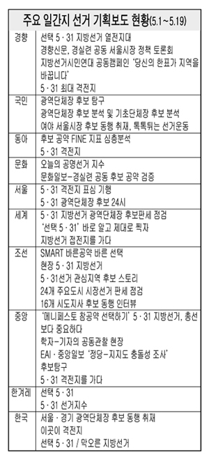 본보가 10개 전국지의 선거 관련 보도를 5월 1일부터 19일까지 분석해 주요 기획보도를 살펴본 결과 대체로 비슷했다.