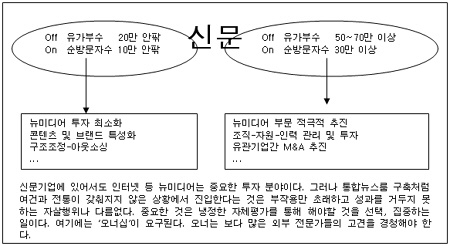 무리한 투자보다 우선순위 결정이 우선그러나 자본, 인력, 인프라가 부족한 마이너 신문기업은 무리한 투자를 해서는 안된다. 조직 전체를 최소화하고 우선 순위를 설정하는 것이 필요하다. 특히 상당한 투자가 필요한 뉴미디어 분야는 신중히 접근해야 한다. 현재 시장 규모와 분위기를 고려할 때 신문기업이 수익을 내기가 쉽지 않기 때문이다.