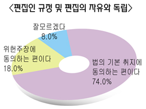 ‘편집인’을 ‘발행인이 선임한 자’가 아닌 ‘편집에 책임을 지는 자’로 규정하고 ‘편집인의 자율적인 편집을 보장해야 한다’고 명시한 신문법 2조와 3조에 대해서 기자의 74.0%가 ‘법안 기본 취지에 동의한다’고 대답했다.
