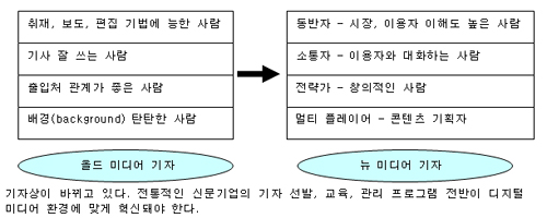 특히 멀티미디어 편집능력을 갖고 있는 멀티 플레이어형 기자는 스타기자의 가능성이 높아진다. 특히 인터넷 환경에 적응할 수 있는 순발력을 가지고 있는 등 지식대중과 끊임없이 소통할 수 있는 열정과 자질도 대단히 중요한 요소다. 물론 아직까지는 이용자들의 능력이 앞서 있다.