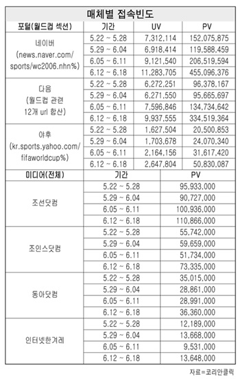 ‘코리안클릭’에 따르면 온라인 공간에서 월드컵 콘텐츠 서비스를 집중하고 있는 네이버, 다음, 야후 등 포털사이트와 조선, 조인스, 동아, 한겨레 등 신문사 사이트에는 월드컵이 개막하면서 접속 빈도가 꾸준히 상승하고 있는 것으로 나타났다.