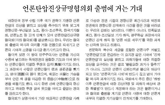 경향신문은 22일 ‘언론탄압진상규명협의회 출범에 거는 기대’라는 사설을 통해 “‘언론탄압진상규명특별법’을 반드시 제정돼야 한다”고 촉구했다.