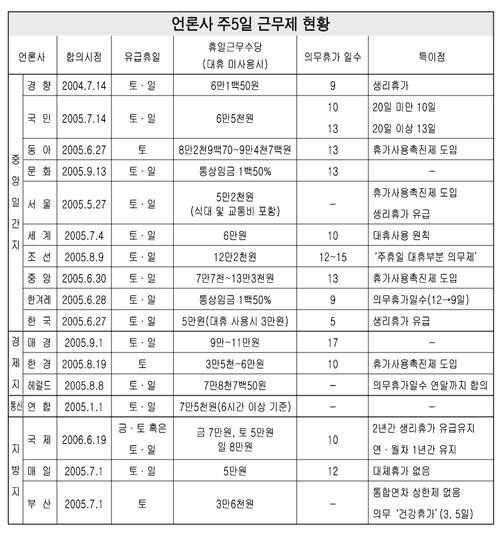 2004년 방송 3사를 시작으로 지난해 전국지, 그리고 내달 1일부터 1백인 이상 지방 신문사들이 ‘주5일 근무제’ 사업장에 포함된다.