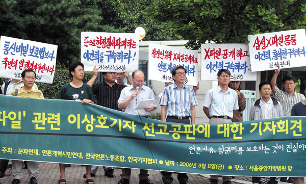 이에 앞서 기자협회는 문화연대, 언론개혁시민연대, 전국언론노동조합 등 언론시민 단체들과 함께 이날 ‘X파일’ 선고전인 오전 9시 30분, 서울중앙지방법원 앞에서 기자회견을 열고 X파일 보도로 인해 통신비밀보호법을 위반했다며 기소된 이상호 기자에 대해 재판부의 현명한 판결을 촉구했다.