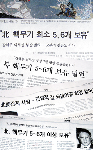한겨레의 경우, 연합뉴스와 자사 기자의 바이라인을 동시에 게재하면서 ‘강석주, 핵무기 5~6개 보유 비쳐’라는 제목으로 보도했다.