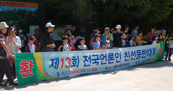 등반대회에 참가한 회원 및 가족들이 등반에 앞서 속리산 매표소 앞에서 가진 기념촬영.