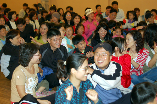 전국 각지에서 모인 회원가족들이 속리산 등정을 마치고 가진 레크리에이션에서 안마를 해주며 서로의 피로를 풀어주고 있다.