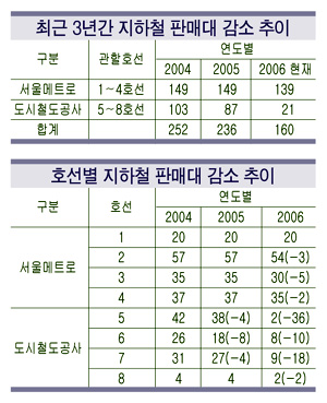 서울메트로(1~4호선)에서 관리하는 가판대는 지난해보다 10개가 줄어든 1백39개가 남은 상태다. 판매 관계자들은 가장 큰 이유로 무료신문이 등장하면서 신문판매량이 40~50%이상 급감했기 때문이라고 분석했다.
