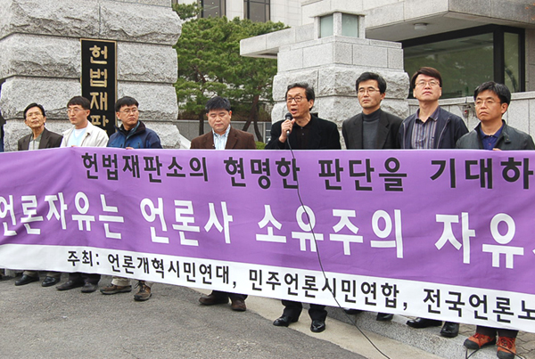 해 넘긴 신문법 논란 노무현 정부가 개혁입법의 하나로 추진, 제정한 신문법에 대한 논란이 계속됐다. 헌법재판소는 6월 동아일보, 조선일보가 낸 신문법 위헌심판 청구 건에서 일부 조항에 대해 위헌과 헌법불합치 결정을 내렸다. 가장 논란이 됐던 ‘시장 지배적 사업자 규정’ 조항은 위헌 결정을 받았다.