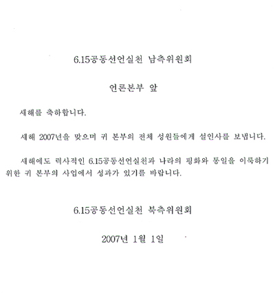 이에 대해 남측 언론본부 측은 “새해에도 우리는 귀 위원회와 함께 역사적인 6.15정신의 함양과 발전을 위해 모든 노력을 다 할 것”이라며 새해 인사를 전달했다.