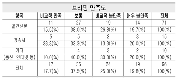 이전 출입처 기자단제도와 비교, 브리핑제도의 만족도를 알아보는 설문에 응답자의 44.8%가 ‘불만족 한다’고 답했다. 기자들은 ‘비교적불만족’ 25.0%와 ‘매우불만족’ 19.8%로 응답해 ‘비교적만족’ 17.7%보다 높았다.