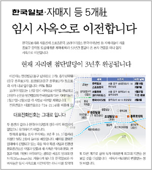 한국은 15일 1면 사고를 통해 “한국일보와 자매사들은 임시 사옥으로 이전이기는 하나 이를 도약의 또 다른 계기로 삼아 독자 여러분께 최고의 지면을 선보일 것을 다짐한다”고 밝혔다.