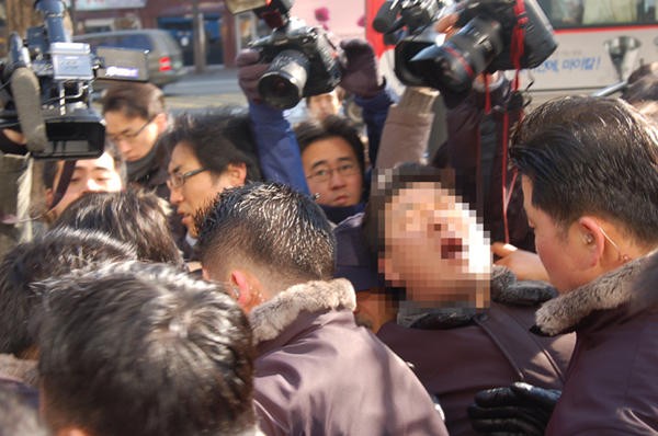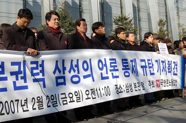 | 언론노조는 2일 오전 11시 회견용 방송 차량을 기자회견장 내로 진입하려 했으나 삼성직원들이 막아서면서 몸싸움이 벌어져 회견이 10분 가량 지체됐다. | ||