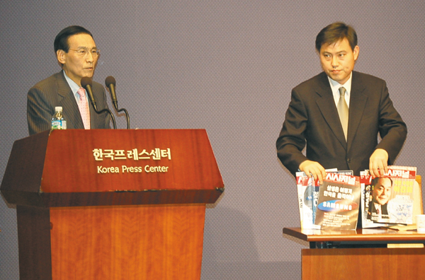 ▲ 시사저널 금창태 사장(왼쪽)은 6일 프레스센터 20층 국제회의장에서 기자회견을 열어 기사 삭제와 직장폐쇄의 정당성을 피력했지만, 또 다른 논란을 야기했다. |