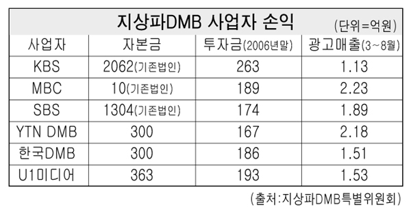 DMB가 리모컨 일체형 TV라는 속성상 광고주의 매력을 끄는데 실패하면서 수익확보가 어렵다는 것이다.