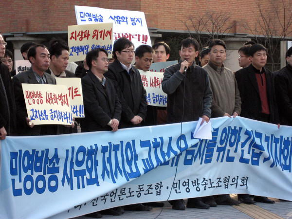 ▲ 지난달 28일 지주회사로의 전환을 의결하는 주주총회에 앞서 언론노조와 민영방송노조협의회는 SBS 목동 방송센터 앞에서 기자회견을 열고 지주회사 전환에 반대하는 주요 주주들을 비판했다. |