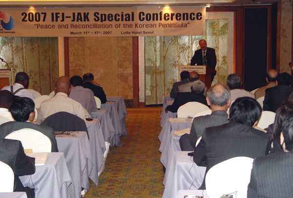 2007 IFJ특별총회가 12일 오전 롯데호텔 에머랄드룸에서 1백30여명의 세계 각국 기자들이 모인 가운데 ‘각국에서 보는 평화와 언론’이라는 주제의 세미나를 시작으로 막이 올랐다.