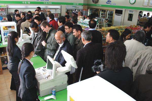 국제기자연맹 특별총회에 참석한 기자들이 16일 개성공단을 방문, 북측 점원들이 운영하는 편의점을 둘러보고 있다.