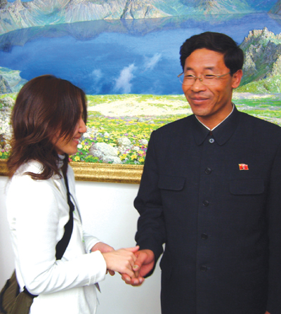 금강산옥류관에서 열린 만찬에서 북측 접대원이 에이든 화이트 IFJ사무총장에게 꽃을 전달하자 화이트 사무총장은 환한 미소로 인사를 하고 있다.