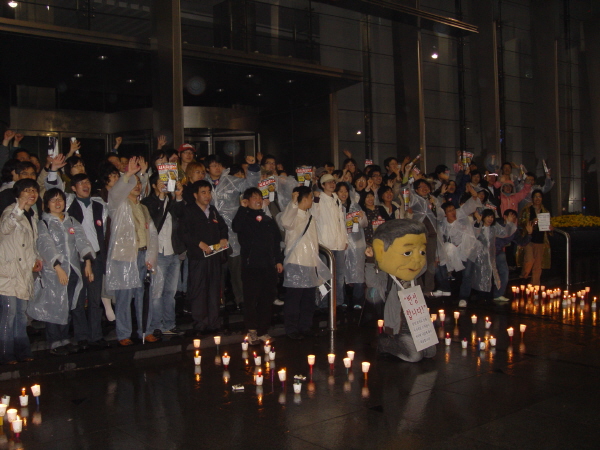 | 노조는 문화제 행사를 마친 뒤, 시민 및 시사모 회원들과 함께 서울역광장에서 삼성본관까지 촛불행진을 진행했다. 노조는 삼성본관 앞에 촛불로 '자유언론'이라는 글씨를 새기고 이번 싸움을 승리로 이끌겠다고 다짐했다. | ||