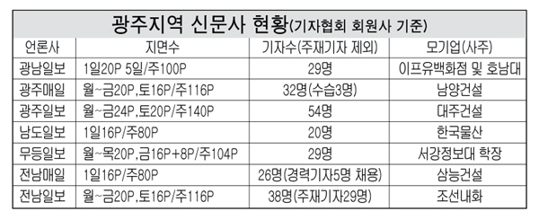 광주지역의 한 기자는 “광고시장이 넓지 않은 광주에서 신문사가 열개가 넘다보니 각종 폐해가 많이 나타나고 있다”며 “특히 관공서에 대한 비판 기사의 실종과 정언유착, 인사 청탁 등이 이뤄지고 있다”고 밝혔다.