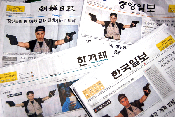 ▲ 국내언론의 버지니아공대 총기 참사 보도에 대해 많은 문제점이 지적되고 있다. 사진은 범인 조승희씨가 양손에 권총을 든 사진을 보도한 주요 신문들의 1면. |