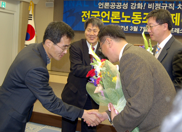 ▲ 3월7일 열린 언론노조 4기 출범식에서 악수를 나누고 있는 김종규 전 수석부위원장, 신학림 전 위원장, 허찬회 신임 수석부위원장, 이준안 신임 위원장(사진 왼쪽부터). |