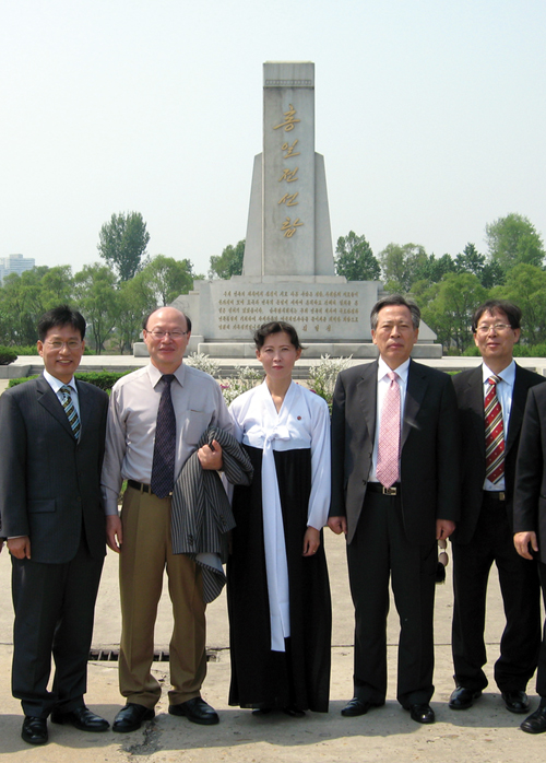 ▲ 남측언론분과 대표단은 7일 오전 1948년 5월 2일 남북정관계, 기자, 종교 대표자들이 만나 남북연석회의를 했던 쑥섬을 찾았다. 이곳 통일전선탑에는 김구 한국독립당 대표와 정진석 남측 대표기자 등 12명의 대표 이름이 새겨져있다. 사진 왼쪽에서 두번째부터 기협 정일용 회장, 북측 안내원, 언론재단 정남기 이사장. |