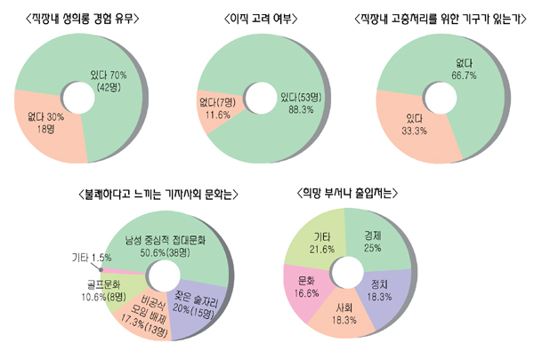 전체 응답자 60명 가운데 70%에 해당하는 42명이 직장생활 중 성희롱을 직·간접으로 경험한 바 있으며 이 중 절반이 넘는 이들(25명, 59.5%)은 성희롱의 주요 발생지로 해당 직장을 꼽았다. 또 출입처에서도 33.3%에 해당하는 14명이 성희롱을 경험 또는 목격했다고 응답했다.
