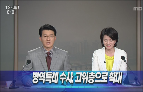 남성앵커인 김병헌 기자가 ‘강재섭 대표 마지막 승부수’라는 기사의 주요내용을 읽는 도중 “이명박 박근혜 두 주..주자는...”이라며 한차례 말을 더듬자 여성앵커인 장미일 기자가 웃음을 터트리기 시작한 것.