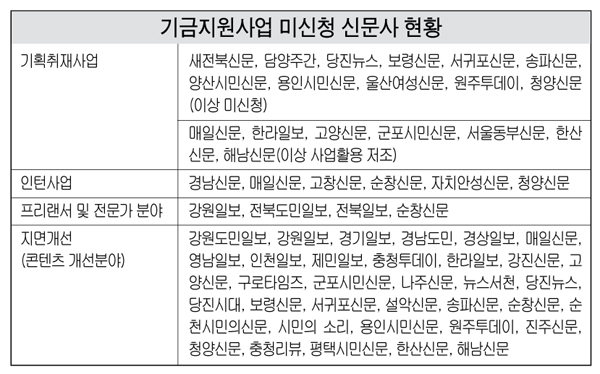 하지만 사업 완료가 4개월 앞으로 다가온 시점에 지원대상 신문사들이 일부 분야별 사업에 신청을 하지 않은 것으로 드러났다. 기획취재 사업의 경우 새전북 신문 등 19개 신문사가 사업을 아예 신청하지 않거나 했어도 활용도가 떨어지는 것으로 나타났다. 또 인턴사업의 경우 경남신문 등 6개사, 프리랜서 전문가 분야는 강원일보 등 4개사, 지면개선-콘텐츠 개선 분야는 강원도민일보 등 34개사가 사업을 신청하지 않았다.