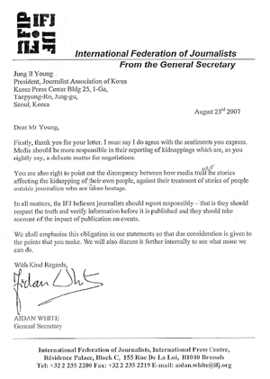 이에 앞서 한국기자협회는 지난달 27일 IFJ 화이트 사무총장에게 서한을 보내 아프가니스탄 한국인 피랍사건에 대한 언론 보도 자제에 협조해줄 것을 요청했다.