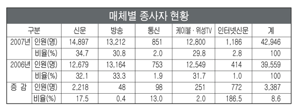 더구나 이런 감소세는 신문사에서 더욱 두드러지게 나타났다. 신문 종사자 수는 1988년 평균 5백13명까지 올라갔으며 이후에도 평균 3백50명 선을 유지했었다. 그러나 IMF 이후 하향세가 뚜렷해져, 1998년 2백88명으로 급감한데 이어 2005년 2백8명, 2006년 1백98명, 2007 1백47명 등 큰 폭의 하강곡선을 보였다.