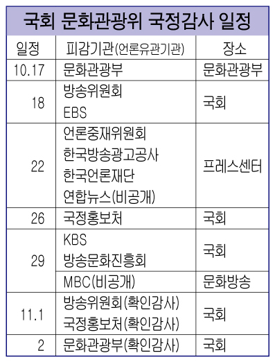 26일엔 국정홍보처(해외홍보원, 한국정책방송원 포함) 국감이 국회에서 열리며 29일 KBS와 방송문화진흥회 감사도 예정돼 있다.