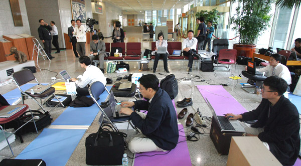 자물쇠가 걸린 기사송고실 앞 로비 한쪽에 깔개를 깔고 기사를 쓰는 기자들. 그들의 결연한 모습에서 어떤 타협을 기대하기란 힘들어 보인다. 오직 ‘원위치’만 있을 뿐이다. 정부 또한 55억원을 들여 만든 새 합동브리핑센터를 헐어버릴 수는 없다. 총리훈령도 바꾸기로 했고, 더 이상의 양보는 없다는 말도 여러 번 했다.