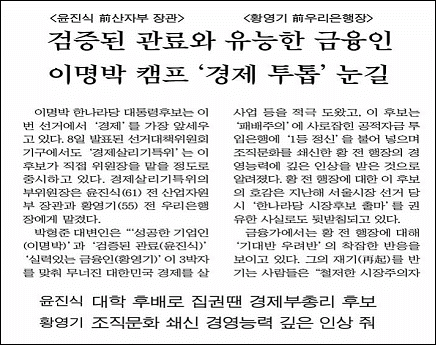 10일부터 이 후보의 선대위와 관련해 조선 등은 거의 한나라당 기관지를 자처하고 나섰다. 조선은 이명박 캠프를 소개하면서 한나라당의 소개 코멘트를 그대로 기사화하며, 구성원들에 대한 칭찬을 아끼지 않았다. 조선일보 5면 기사를 보자.