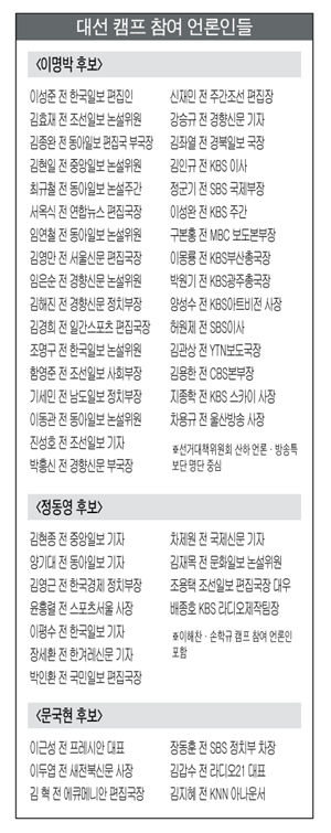언론계 안팎 우려 어린 시선그럼에도 불구하고 언론인들이 정치판으로 말을 갈아타는데 대해 언론계 안팎에서는 우려 섞인 시선을 보낸다. 대선캠프에서 언론인들을 끌어들이는 이유 가운데 대 언론 로비가 상당한 비중을 차지한다. 해당 언론인의 인맥, 선후배 관계 등을 활용해 최소한 악의적인 기사가 나오지 않도록 하는 역할을 기대하고 있는 것이다. 변상욱 CBS 대기자는 “선후배 인맥을 활용해 언론 보도에 영향을 주는 경우가 있다”며 “특정 학맥으로 이뤄지거나 사주의 입김이 강한 회사라면 그럴 가능성이 짙다”고 말했다.