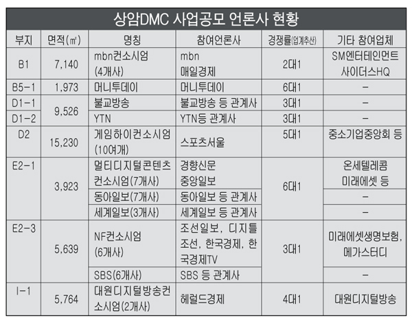 서울시가 지난달 30~31일 DMC 첨단산업용지 12필지(8만6천76㎡)에 대한 공급신청 접수를 받은 결과, 경향신문 동아일보 세계일보 조선일보 중앙일보 SBS YTN 매일경제TV 불교방송 한국경제TV 매일경제 머니투데이 한국경제 헤럴드경제 스포츠서울 등 15개 신문·방송사가 단독 혹은 컨소시엄 형태로 참여했다.