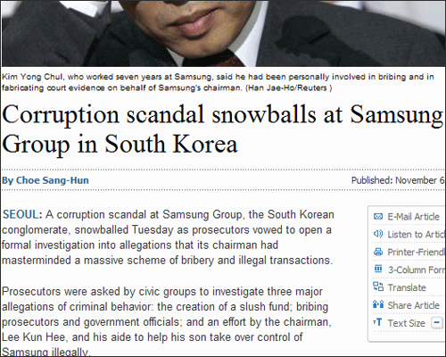 ▲ 인터내셔널 헤럴드 트리뷴(IHI) 홈페이지에 웹출판된 삼성 비자금 의혹 사건 기사 "Corruption scandal snowballs at Samsung Group in South Korea" |