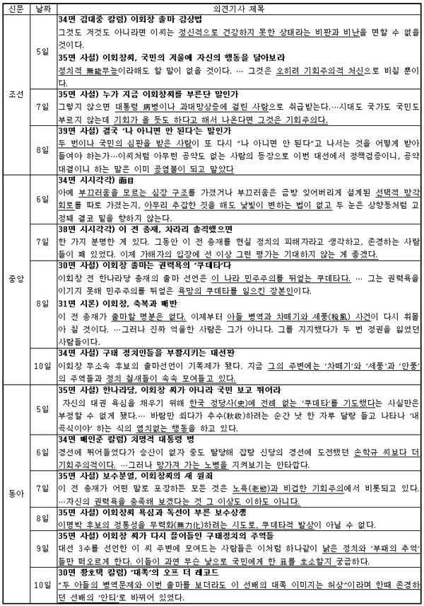 ▲ [표1]조선, 중앙, 동아의 이회창 후보에 대한 원색적 비난 사례 |
