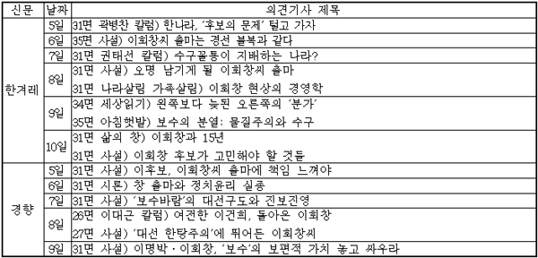 반면 한겨레와 경향신문은 이회창 후보의 출마가 가능할 수밖에 없는 대한민국 정치의 현실, 정책 없이 인물들만 넘실대는 대선의 치부를 구조적인 문제에서 찾았다. 정당정치의 실종이 바로 그 원인이었다. 그래서 정책이 부재했고, 검증이 없었고, 한나라당을 창당한 이회창 후보가 그 당을 떠나면서 후보 등록을 불과 20여일 앞두고 대선 출마를 선언, 지지율 20%대를 한 번에 획득할 수 있었던 것이다.