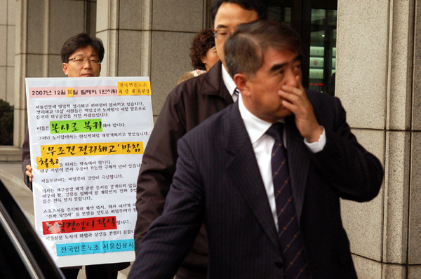 10일 오전 서울 태평로 프레스센터 서울신문사 1층 현관에서 최상재 전국언론노조 위원장이 서울신문 정리해고 중단을 촉구하는 1인 시위를 하고 있는 동안 박종선 부사장이 당혹스러운 표정을 지으며 차에 오르고 있다.