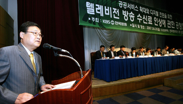 ▲ 지난 6월 열렸던 ‘TV수신료 인상안에 대한 공청회’에서 정연주 KBS사장이 인사말을 하고 있다.(연합뉴스) |