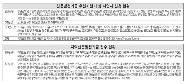 한국일보 등 80개 신문사가 신문발전기금을, 경기일보 등 1백2개사가 지역신문발전기금을 각각 신청한 것으로 나타났다.